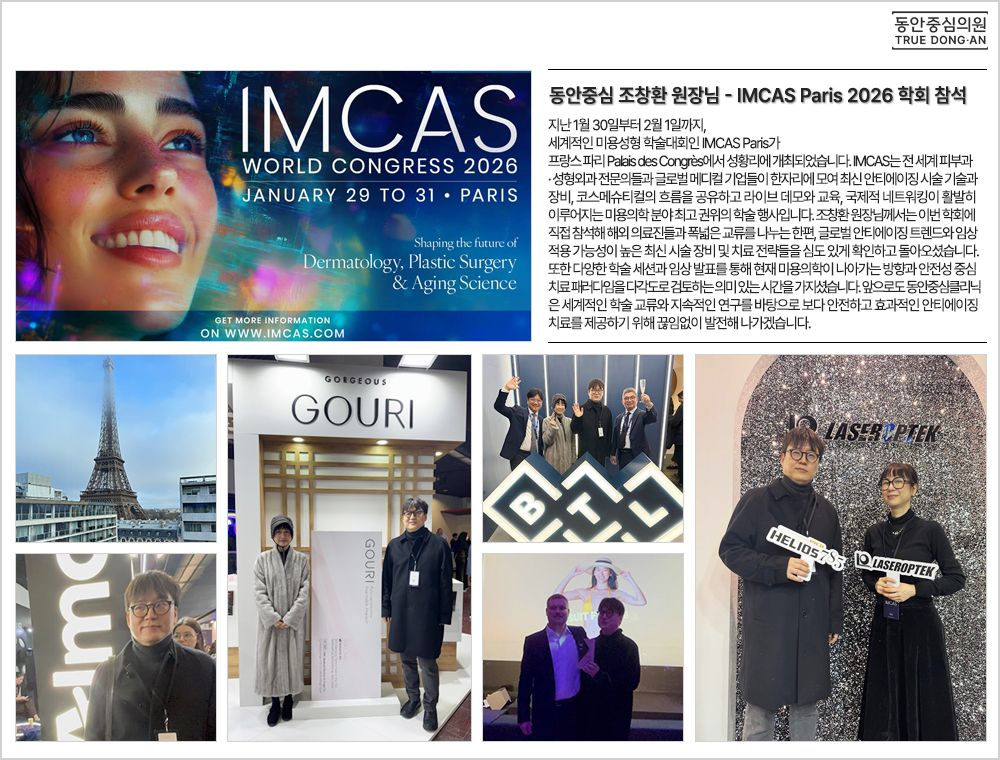 지난 1월 30일부터 2월 1일까지, 세계적인 미용성형 학술대회인 IMCAS Paris가 프랑스 파리 Palais des Congrès에서 성황리에 개최되었습니다. IMCAS는 전 세계 피부과·성형외과 전문의들과 글로벌 메디컬 기업들이 한자리에 모여 최신 안티에이징 시술 기술과 장비, 코스메슈티컬의 흐름을 공유하고 라이브 데모와 교육, 국제적 네트워킹이 활발히 이루어지는 미용의학 분야 최고 권위의 학술 행사입니다. 조창환 원장님께서는 이번 학회에 직접 참석해 해외 의료진들과 폭넓은 교류를 나누는 한편, 글로벌 안티에이징 트렌드와 임상 적용 가능성이 높은 최신 시술 장비 및 치료 전략들을 심도 있게 확인하고 돌아오셨습니다. 또한 다양한 학술 세션과 임상 발표를 통해 현재 미용의학이 나아가는 방향과 안전성 중심 치료 패러다임을 다각도로 검토하는 의미 있는 시간을 가지셨습니다. 앞으로도 동안중심클리닉은 세계적인 학술 교류와 지속적인 연구를 바탕으로 보다 안전하고 효과적인 안티에이징 치료를 제공하기 위해 끊임없이 발전해 나가겠습니다. ![]() |