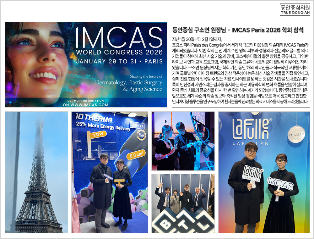 지난 1월 30일부터 2월 1일까지, 프랑스 파리 Palais des Congrès에서 세계적 규모의 미용성형 학술대회 IMCAS Paris가 개최되었습니다. 이번 학회는 전 세계 수만 명의 피부과·성형외과 전문의와 글로벌 의료 기업들이 참여해 최신 시술 기술과 장비, 코스메슈티컬의 발전 방향을 공유하고, 다양한 라이브 시연과 교육 프로그램, 국제적인 학술 교류와 네트워킹이 활발히 이루어진 자리였습니다. 구소연 원장님께서는 학회 기간 동안 해외 의료진들과 적극적인 교류를 이어가며 글로벌 안티에이징 트렌드와 임상 적용성이 높은 최신 시술 장비들을 직접 확인하고, 실제 진료 현장에 접목할 수 있는 치료 인사이트를 넓히는 뜻깊은 시간을 보내셨습니다. 특히 안전성과 자연스러운 결과를 중시하는 최근 미용의학의 변화 흐름을 면밀히 살피며 환자 중심 치료의 중요성을 다시 한 번 확인하는 계기가 되었습니다. 동안중심클리닉은 앞으로도 세계 수준의 학술 정보와 축적된 임상 경험을 바탕으로 더욱 정교하고 안전한 안티에이징 솔루션을 연구·도입하여 환자분들께 신뢰받는 의료 서비스를 제공해 드리겠습니다. ![]() |