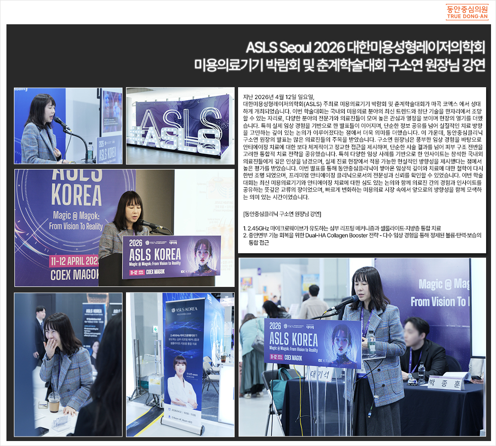 지난 2026년 4월 12일 일요일, 대한미용성형레이저의학회(ASLS) 주최로 미용의료기기 박람회 및 춘계학술대회가 마곡 코엑스 에서 성대하게 개최되었습니다. 이번 학술대회는 국내외 미용의료 분야의 최신 트렌드와 첨단 기술을 한자리에서 조망할 수 있는 자리로, 다양한 분야의 전문가와 의료진들이 모여 높은 관심과 열정을 보이며 현장의 열기를 더했습니다. 특히 실제 임상 경험을 기반으로 한 발표들이 이어지며, 단순한 정보 공유를 넘어 실질적인 치료 방향을 고민하는 깊이 있는 논의가 이루어졌다는 점에서 더욱 의미를 더했습니다. 이 가운데, 동안중심클리닉 구소연 원장의 발표는 많은 의료진들의 주목을 받았습니다. 구소연 원장님은 풍부한 임상 경험을 바탕으로 안티에이징 치료에 대한 보다 체계적이고 정교한 접근을 제시하며, 단순한 시술 결과를 넘어 피부 구조 전반을 고려한 통합적 치료 전략을 공유했습니다. 특히 다양한 임상 사례를 기반으로 한 인사이트는 참석한 국내외 의료진들에게 깊은 인상을 남겼으며, 실제 진료 현장에서 적용 가능한 현실적인 방향성을 제시했다는 점에서 높은 평가를 받았습니다. 이번 발표를 통해 동안중심클리닉이 쌓아온 임상적 깊이와 치료에 대한 철학이 다시 한번 조명 되었으며, 프리미엄 안티에이징 클리닉으로서의 전문성과 신뢰를 확인할 수 있었습니다. 이번 학술대회는 최신 미용의료기기와 안티에이징 치료에 대한 심도 있는 논의와 함께 의료진 간의 경험과 인사이트를 공유하는 뜻깊은 교류의 장이었으며, 빠르게 변화하는 미용의료 시장 속에서 앞으로의 방향성을 함께 모색하는 의미 있는 시간이었습니다. [동안중심클리닉 구소연 원장님 강연] 1. 2.45GHz 마이크로웨이브가 유도하는 심부 리프팅 메커니즘과 셀룰라이트·지방층 통합 치료 2. 중안면부 기능 회복을 위한 Dual-HA Collagen Booster 전략 - 다수 임상 경험을 통해 정제된 볼륨·탄력·보습의 통합 접근 ![]() |