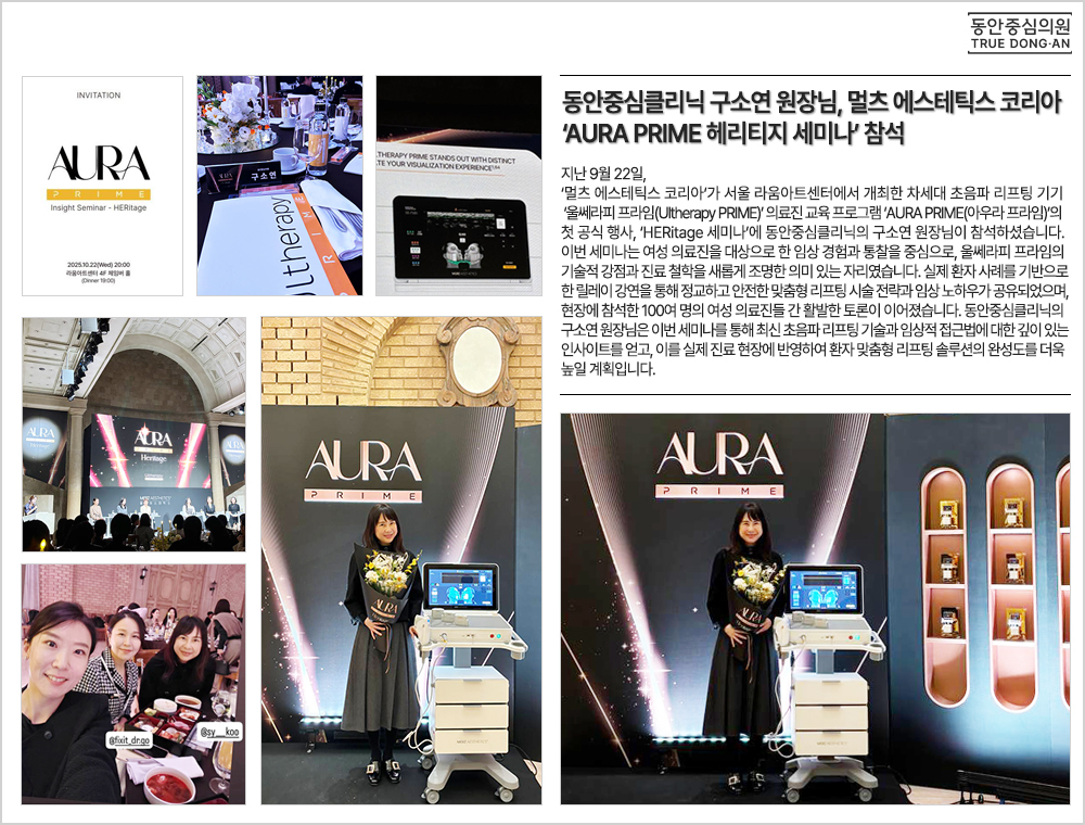 지난 9월 22일, ‘멀츠 에스테틱스 코리아‘가 서울 라움아트센터에서 개최한 차세대 초음파 리프팅 기기 ‘울쎄라피 프라임(Ultherapy PRIME)’ 의료진 교육 프로그램 ‘AURA PRIME(아우라 프라임)’의 첫 공식 행사, ‘HERitage 세미나’에 동안중심클리닉의 구소연 원장님이 참석하셨습니다. 이번 세미나는 여성 의료진을 대상으로 한 임상 경험과 통찰을 중심으로, 울쎄라피 프라임의 기술적 강점과 진료 철학을 새롭게 조명한 의미 있는 자리였습니다. 실제 환자 사례를 기반으로 한 릴레이 강연을 통해 정교하고 안전한 맞춤형 리프팅 시술 전략과 임상 노하우가 공유되었으며, 현장에 참석한 100여 명의 여성 의료진들 간 활발한 토론이 이어졌습니다. 동안중심클리닉의 구소연 원장님은 이번 세미나를 통해 최신 초음파 리프팅 기술과 임상적 접근법에 대한 깊이 있는 인사이트를 얻고, 이를 실제 진료 현장에 반영하여 환자 맞춤형 리프팅 솔루션의 완성도를 더욱 높일 계획입니다. ![]() |