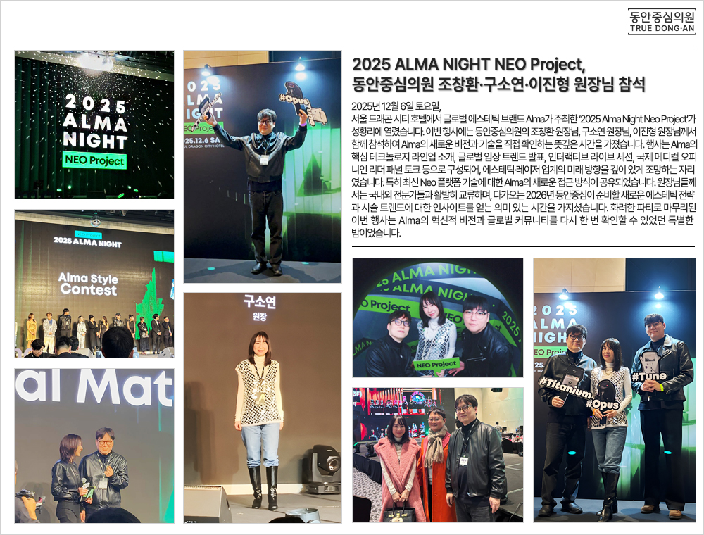 | 142 | 2025 ALMA NIGHT NEO Project, 동안중심의원 조창환·구소연·이진형 원장님 참석 | 2025.12.12 | 641 |