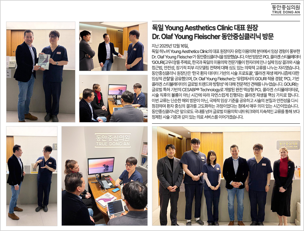 지난 2025년 12월 16일, 독일 하노버 Young Aesthetics Clinic의 대표 원장이자 유럽 미용의학 분야에서 임상 경험이 풍부한 Dr. Olaf Young Fleischer가 동안중심클리닉을 방문했습니다. 이번 방문은 PCL 콜라겐 스티뮬레이터 ‘GOURI(고우리)’를 주제로, 한국과 독일의 미용의학 전문가들이 한자리에 만나 실제 임상 결과와 시술 접근법, 안전성, 장기적 피부 리모델링 전략에 대해 심도 있는 의학적 교류를 나누는 자리였습니다. 동안중심클리닉 원장단은 ‘한국 환자 데이터 기반의 시술 프로토콜’, ‘콜라겐 재생 메커니즘에 대한 임상적 관찰’을 공유했으며, Dr. Olaf Young Fleischer는 ‘유럽에서의 GOURI 적용 경험’, ‘PCL 기반 콜라겐 스티뮬레이터의 글로벌 트렌드와 방향성’ 에 대해 전문적인 견해를 나누었습니다. GOURI는 글로벌 특허 기반의 CESABP® Technology로 개발된 완전 액상형 PCL 콜라겐 스티뮬레이터로, 시술 직후의 볼륨이 아닌 시간에 따라 자연스럽게 진행되는 콜라겐 재생을 핵심 가치로 합니다. 이번 교류는 단순한 해외 방문이 아닌, 국제적 임상 기준을 공유하고 시술의 본질과 안전성을 다시 점검하며 환자 중심의 결과를 고도화하는 과정이었다는 점에서 매우 의미 있는 시간이었습니다. 동안중심클리닉은 앞으로도 국내를 넘어 글로벌 미용의학 네트워크와의 지속적인 교류를 통해 보다 정제된 시술 기준과 깊이 있는 의료 서비스를 이어가겠습니다. ![]() |