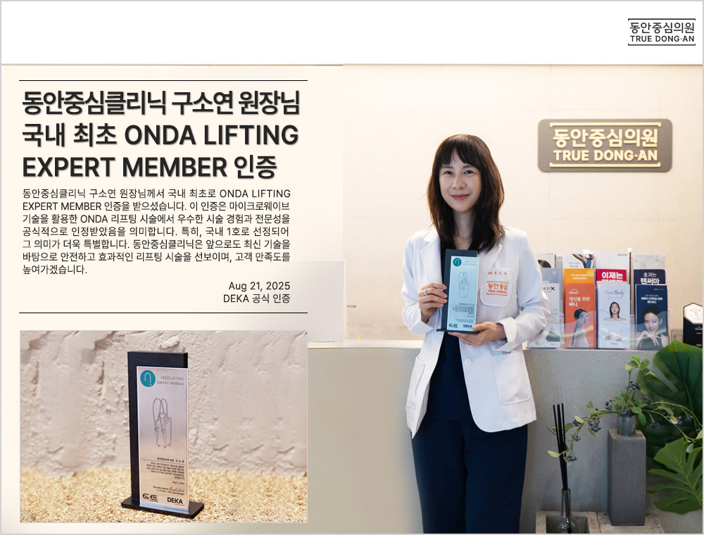 동안중심클리닉 구소연 원장님께서 국내 최초로 ONDA LIFTING EXPERT MEMBER 인증을 받으셨습니다. 이 인증은 마이크로웨이브 기술을 활용한 ONDA 리프팅 시술에서 우수한 시술 경험과 전문성을 공식적으로 인정받았음을 의미합니다. 특히, 국내 1호로 선정되어 그 의미가 더욱 특별합니다. 동안중심클리닉은 앞으로도 최신 기술을 바탕으로 안전하고 효과적인 리프팅 시술을 선보이며, 고객 만족도를 높여가겠습니다. Aug 21, 2025 DEKA 공식 인증 ![]() |