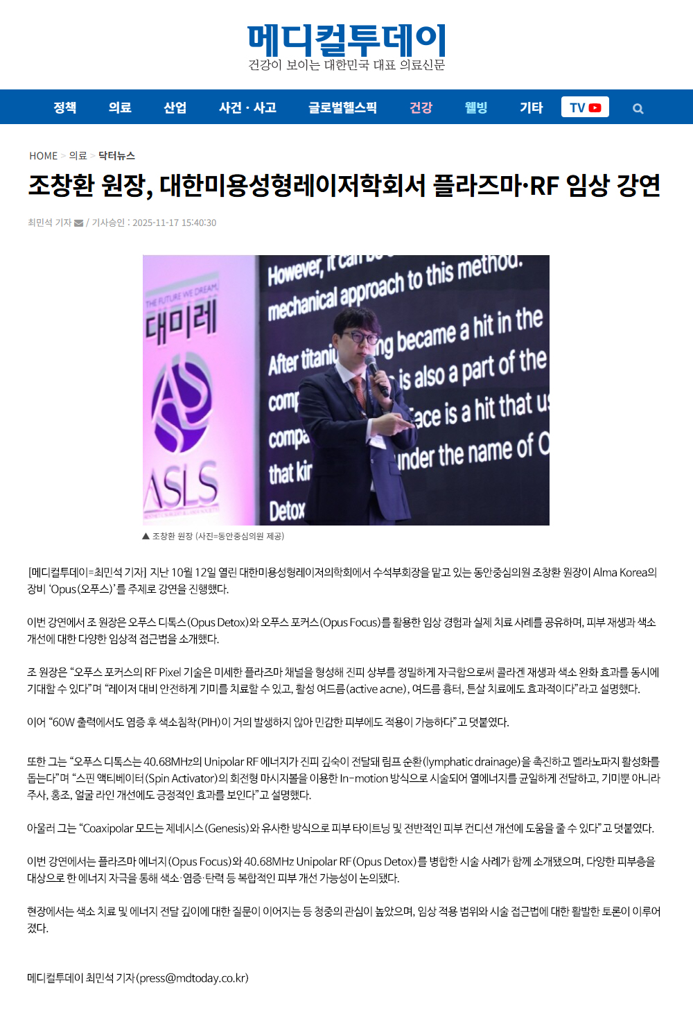 | 13 | 동안중심의원 조창환 원장, 대한미용성형레이저학회서 플라즈마·RF 임상 강연 | 2025.11.11 | 271 |