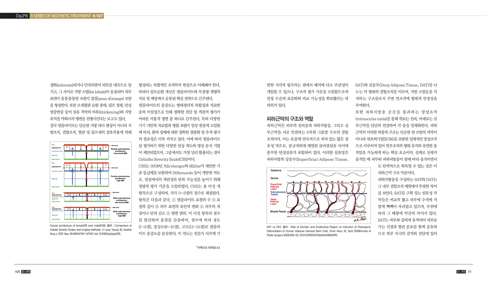 조직 사이에 체액과 노폐물이 고여 부종이 생기고, 이로 인해 지방세포 대사환경이 나빠지면서 셀룰라이트가 심화된다. 피하근막은 얕은 지방층(SAT)과 깊은 지방층(DAT)을 구분하는 핵심 구조로,